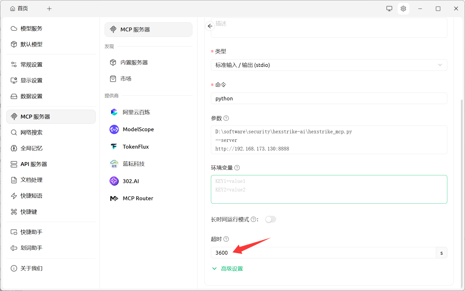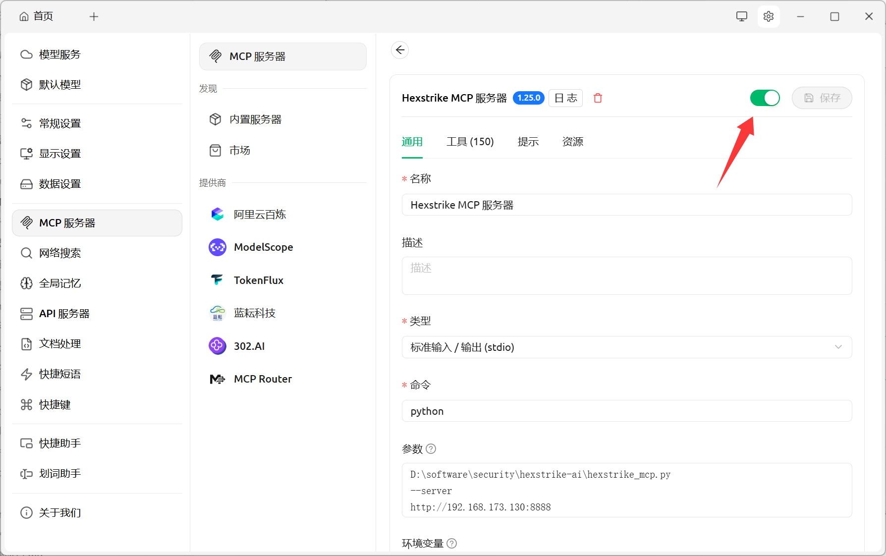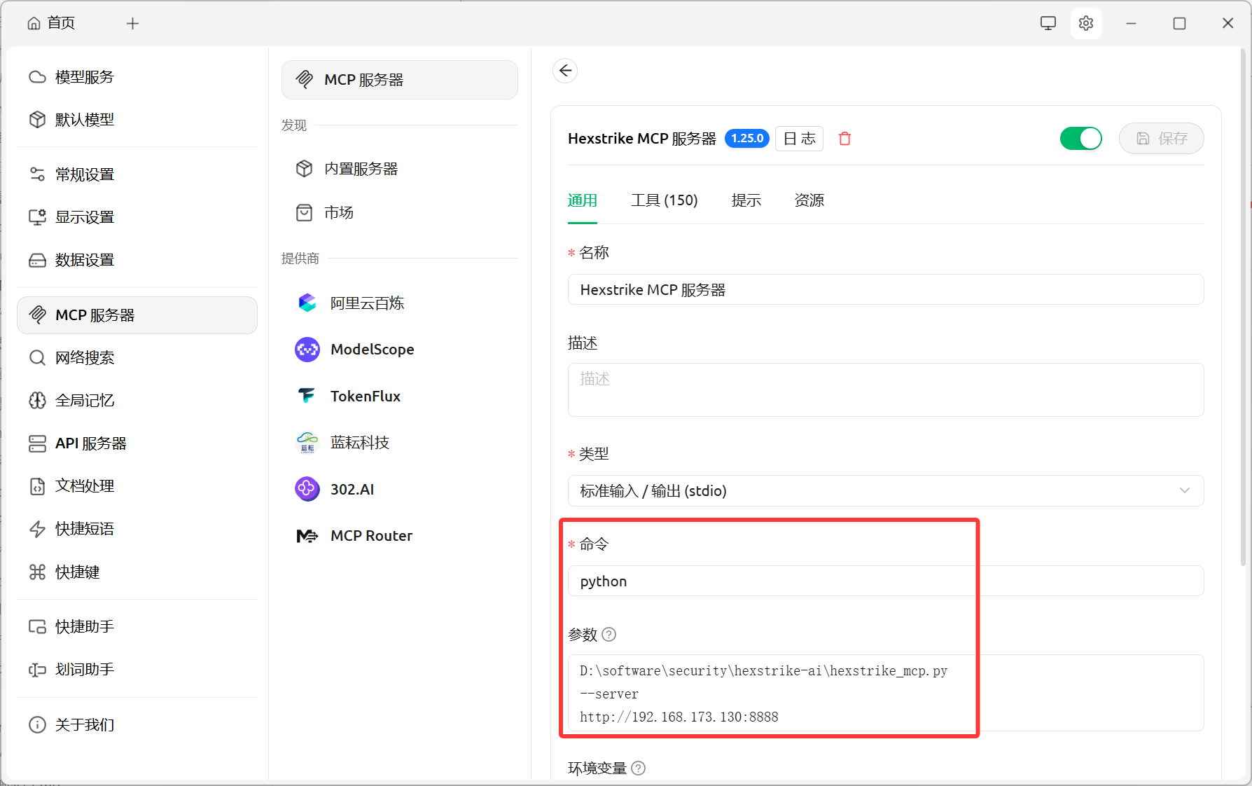 hexstrike_mcp.py文件的路径,IP地址需要填上面kali的地址