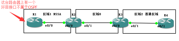 - 按照如图所示配置好基础的环境。其中区域1是NSSA区域。