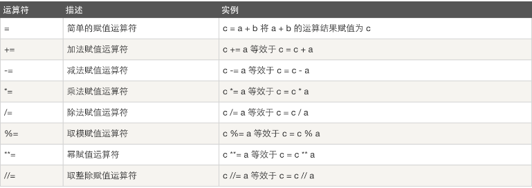 | = %= /= //= -= += = *= | 赋值运算符 |