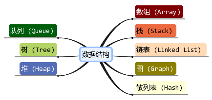 常用的数据结构有:数组,栈,链表,队列,树,图,堆,散列表等,如图所示:
