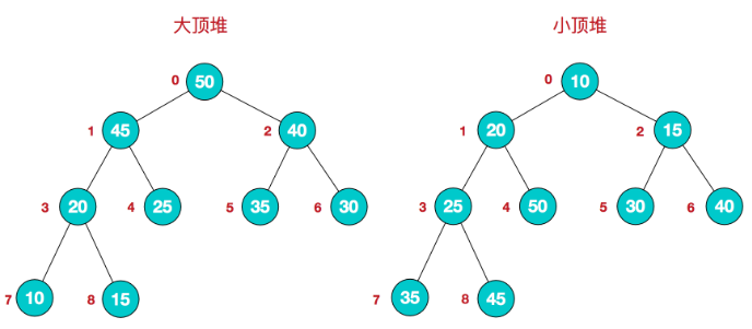 (ki <= k2i,ki <= k2i+1)或者(ki >= k2i,ki >= k2i+1), (i = 1,2,3,4…n/2),满足前者的表达式的成为小顶堆,满足后者表达式的为大顶堆,这两者的结构图可以用完全二叉树排列出来,示例图如下:
