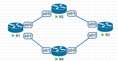 我们发现R1去往R3的3.3.3.0/24有两个下一跳,说明是负载均衡,然后我发现两个下一跳的度量值都是435200说明是等价负载均衡,表示数据会一个下一跳发一个。