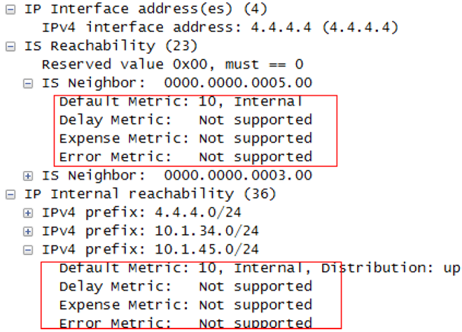 | IP 内部可达性信息 | 128 | RFC1195 | 列举了直连的 IP 地址前缀列表,它只在非伪节点 LSP 中使用。 每个 IP 前缀分配了一堆的 metric。 |
