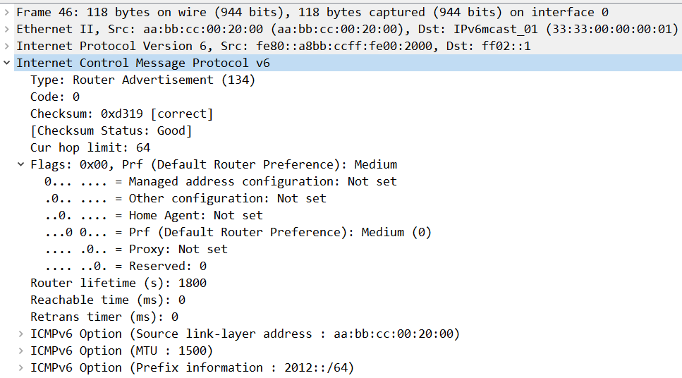 - 如果not managed位为1表示主机使用有状态地址自动配置(如DHCPv6)