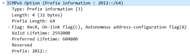 - 表示当PC使用该RA通告的前缀构建IPv6地址,那么该PC发送的IPv6报文hoplimit都是该值(64)
