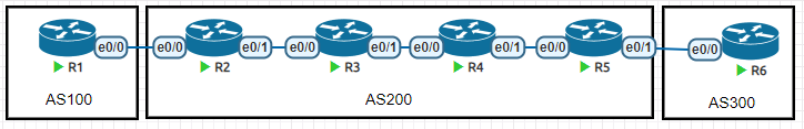 其中R2345内部启用OSPF,R2和R5建立BGP邻居关系,R1是AS100,R6是AS300。R1和R6的环回接口宣告进BGP