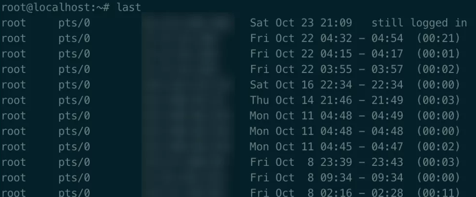 使用strace抓取密码,必须要管理员登录才行,我们可以使用last命令来查看管理员最后登录的时间,登录顺序,由近到远