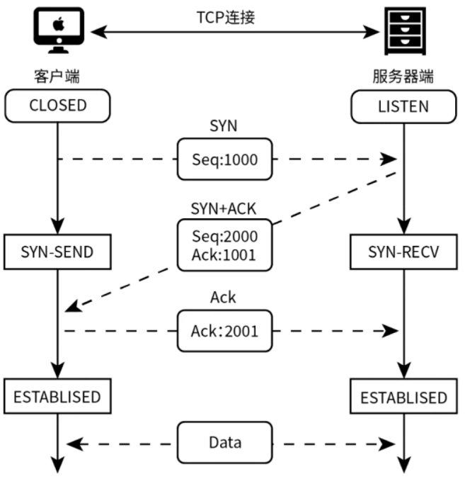 接收端收到SYN包,发送SYN_ACK,对发送端进行确认,进入SYN_RECV状态;发送端收到SYN_ACK包,向接收端发送ACK,双方连接建立完成。
