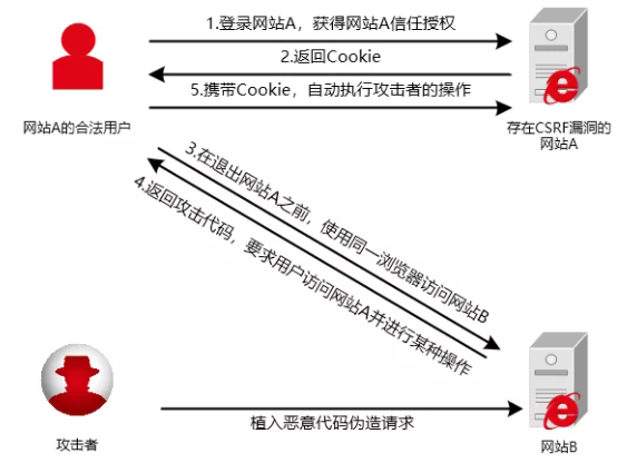 较为典型的CSRF攻击例如“银行网站转账”攻击,用户登陆银行A网站完成转账操作后,在浏览器“身份”信息未失效前,攻击者通过某种手段诱使用户打开CSRF攻击B网站,此时B网站可以插入一条经过特殊构造的URL,其中包含A网站的地址与转账命令。而A网站的服务器此时检测到刚刚转完账的用户带着“身份”信息又来了,系统会判定这是本人在操作,同意本次的交易请求。用户在毫不知情的情况下,就被攻击者利用本地信息转走了存款。