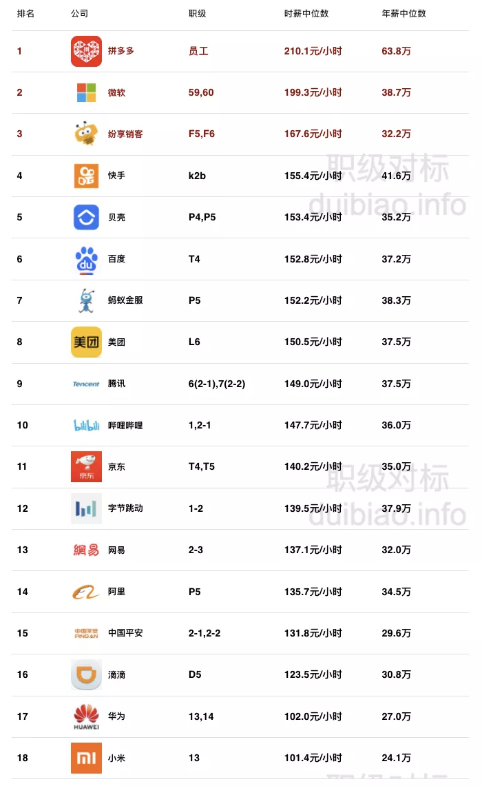 - 微软、拼多多的时薪在初级、中级、高级工程师中都是非常能打的。