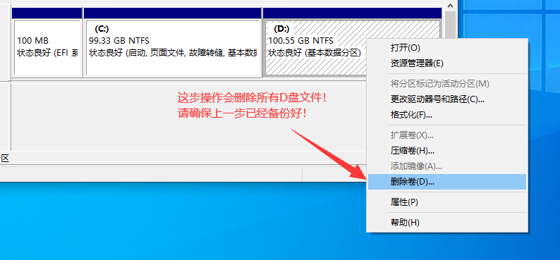 注意,现在C盘是99G的大小哦,右键D盘,选择删除卷