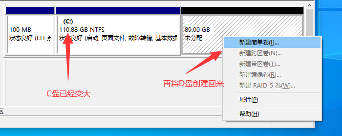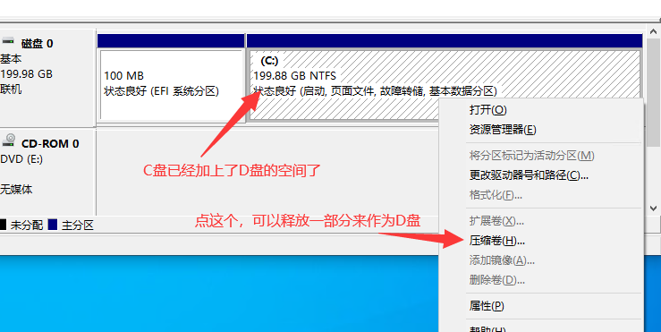现在D盘已经完全融入C盘啦,如果你只是想用部分D盘的空间,这个时候可以对C盘进行压缩卷