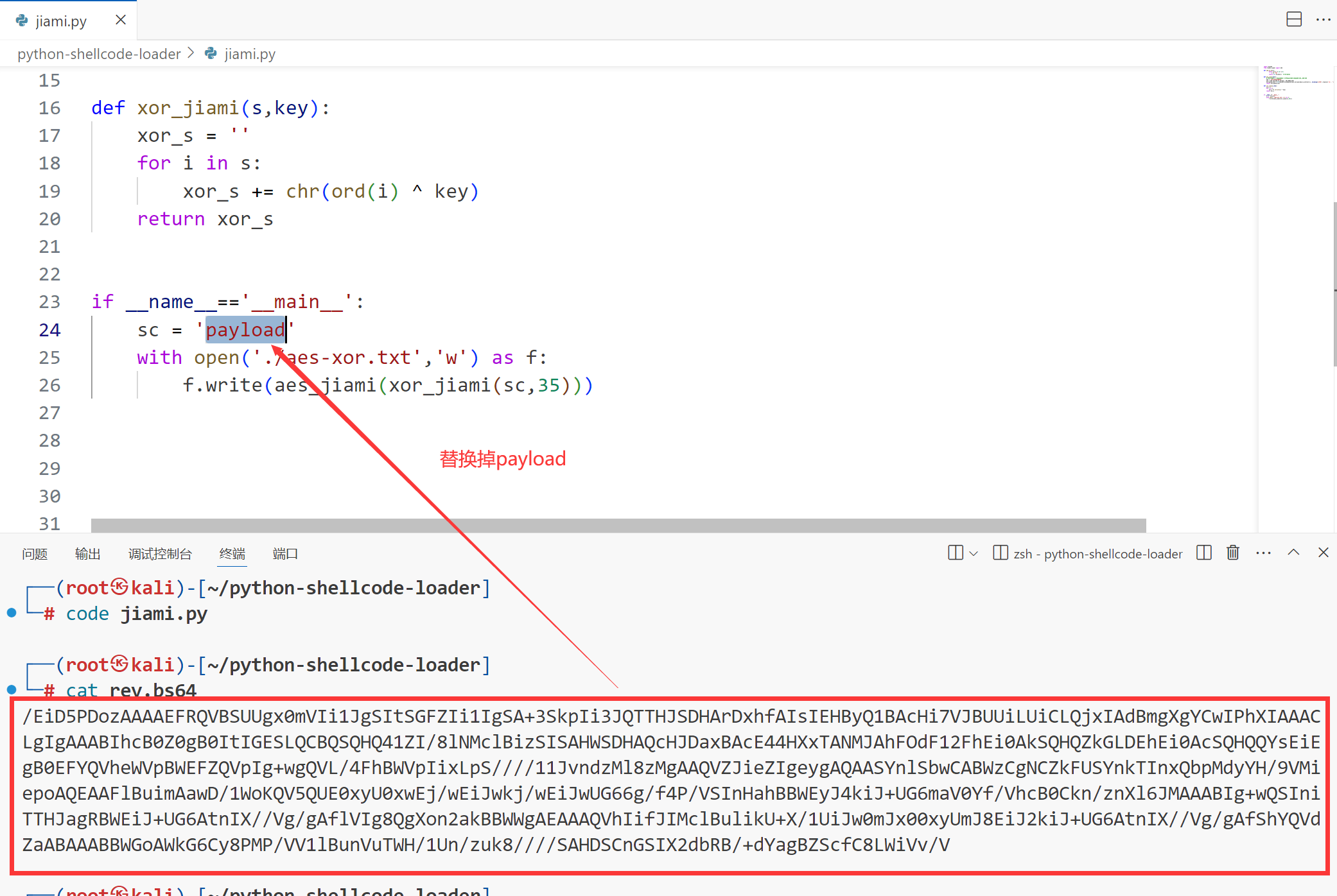 复制base64的值替换jiami.py中payload 也就是 第二十四行 sc='payload'