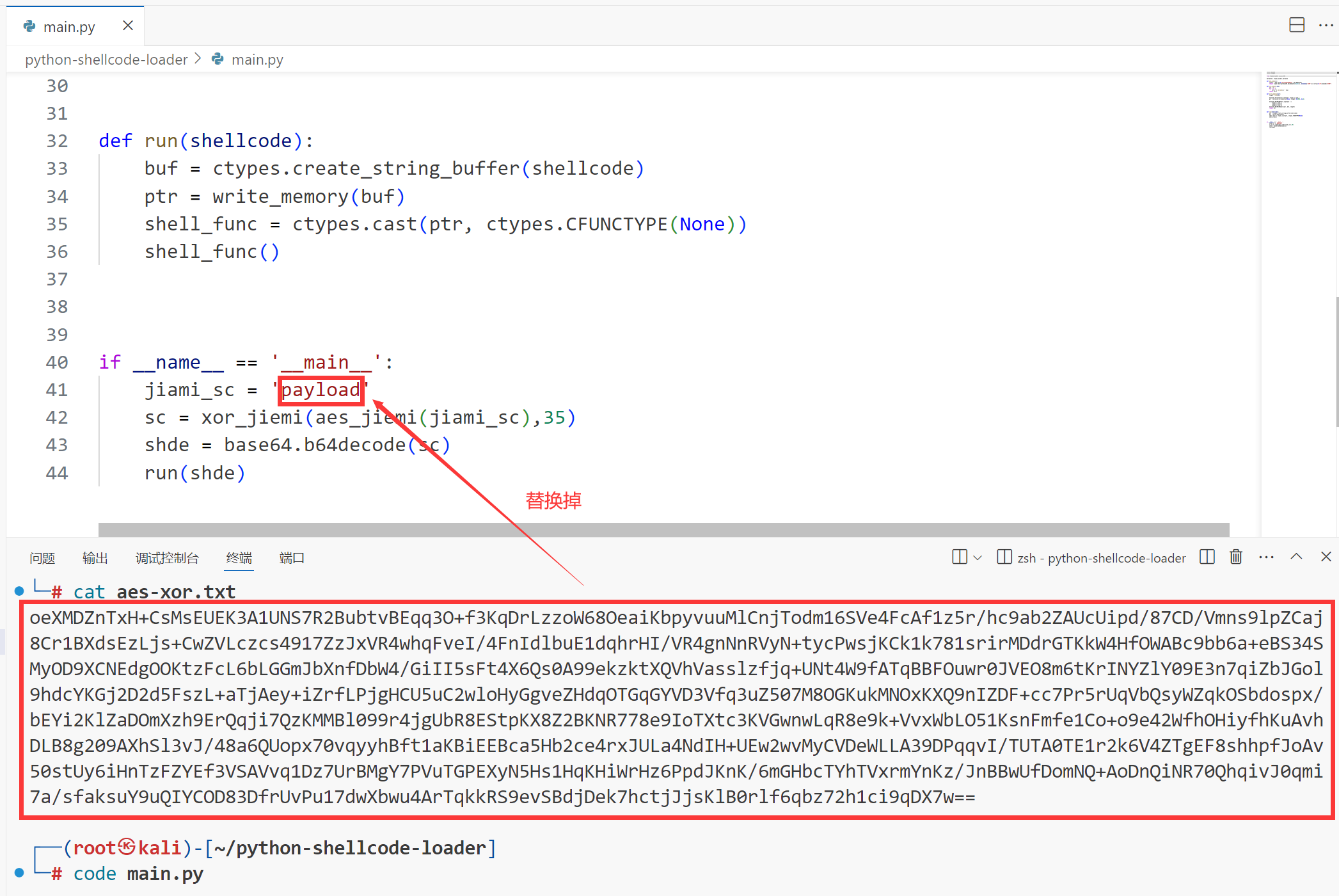#会生成一个aes-xor.txt的文件,复制文件里的值(经过XOR和AES加密后)复制的值替换main.py中的payload 也就是第四十一行 jiami_sc='payload'