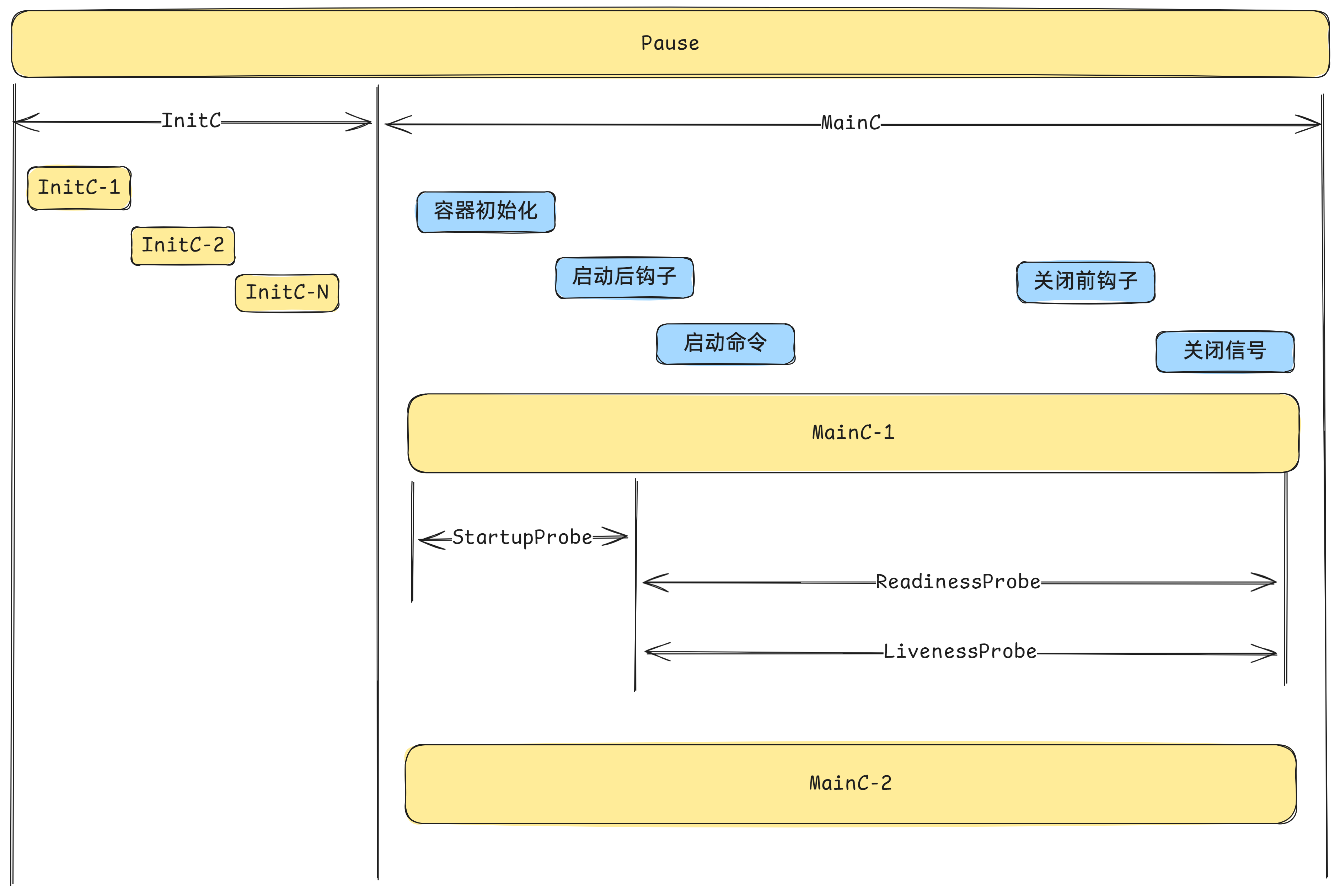 Pod⽣命周期中的initC、startupProbe、livenessProbe、readinessProbe、hook都是可以并且存在的,可以选择全部、部分或者完全不用。