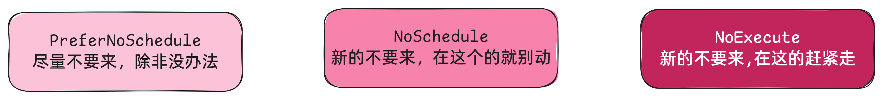 - PreferNoSchedule:kubernetes将尽量避免把Pod调度到具有该污点的Node上,除非没有其他节点可调度